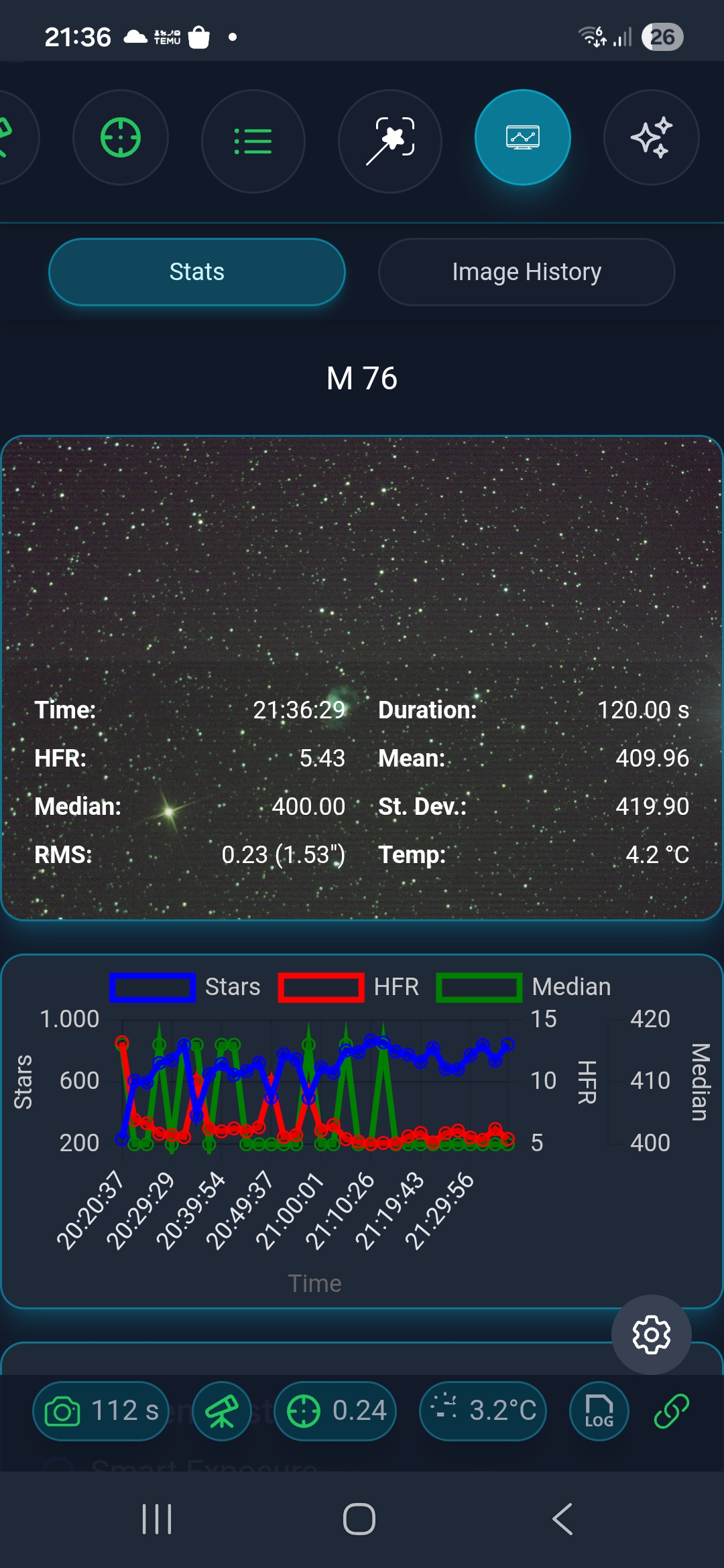 M76 is a bipolar planetary nebula in Perseus, the cast-off envelope of a dying Sun-like star. We see a dense, edge-on ring/torus as the bright central “bar,” with two fainter lobes expanding from its ends—hence the “little dumbbell” look. A very hot white dwarf in the center bathes the gas in ultraviolet light, making it glow in characteristic lines: teal-green [O III], deep H-alpha, and knotty [N II] features along shock fronts. The bright bar spans only a few arcminutes, but a much fainter outer halo extends well beyond it—the fossil record of earlier mass-loss episodes during the star’s AGB phase. Distance estimates vary, placing M76 roughly 2,500–3,400 light-years away. Wikipedia+2esahubble.org+2