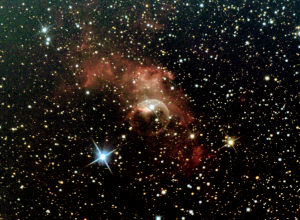 The nebula is a region of active star formation, where powerful stellar winds and radiation from newly formed massive stars sculpt dramatic shapes in the surrounding interstellar gas and dust. Glowing clouds of hydrogen gas give it a bright reddish appearance in narrowband imaging (Hα), while oxygen emissions add striking blue-green highlights.